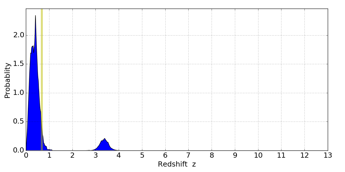 In P(z) plots: Yellow lines mark the cluster redshift z = 0.677,