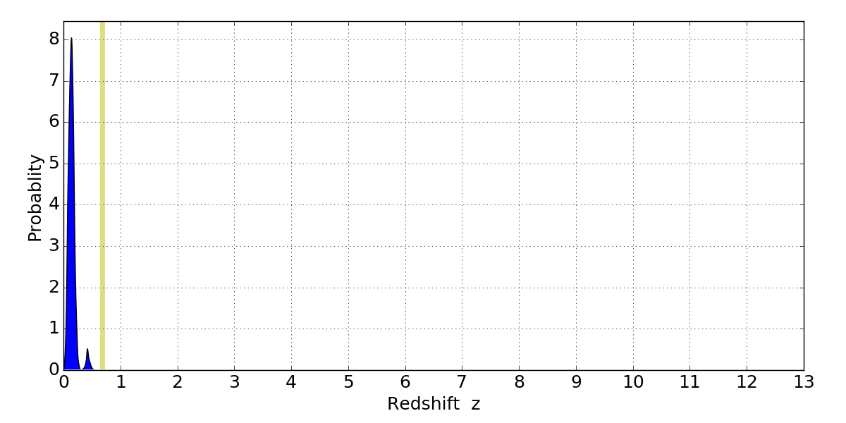 In P(z) plots: Yellow lines mark the cluster redshift z = 0.677,