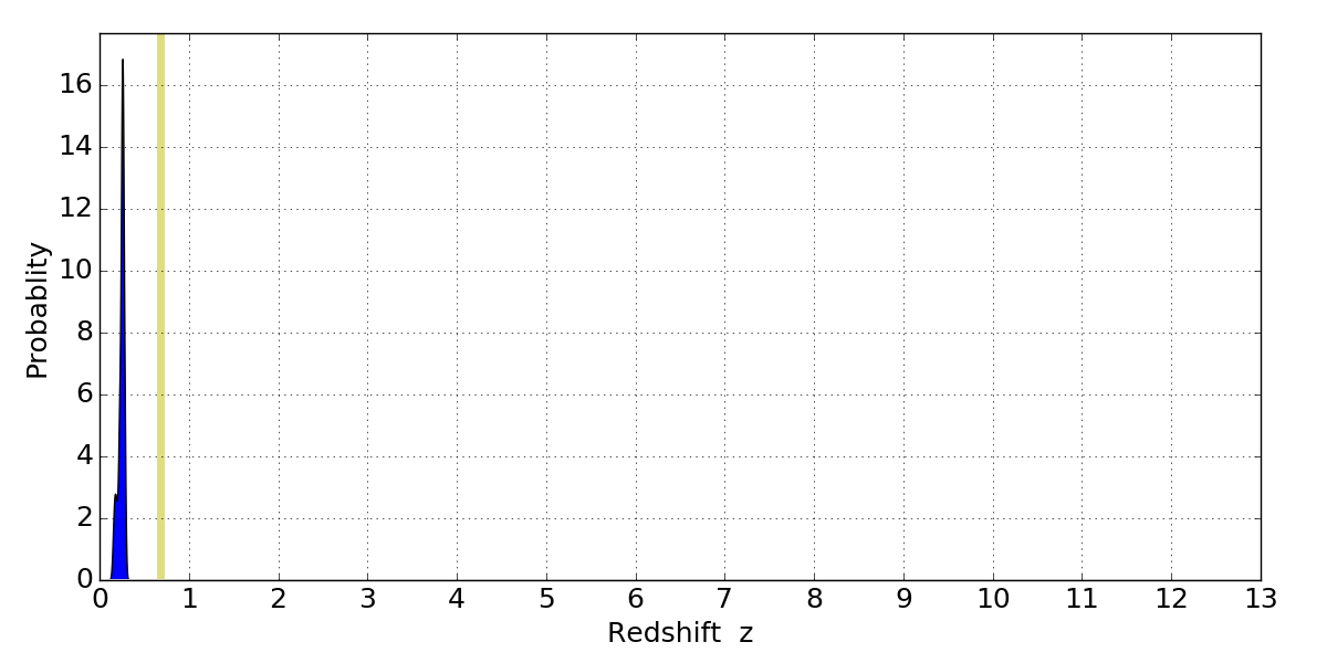 In P(z) plots: Yellow lines mark the cluster redshift z = 0.677,
