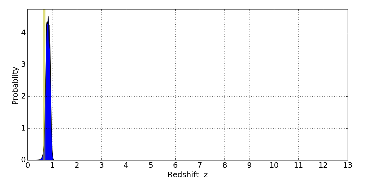 In P(z) plots: Yellow lines mark the cluster redshift z = 0.677,