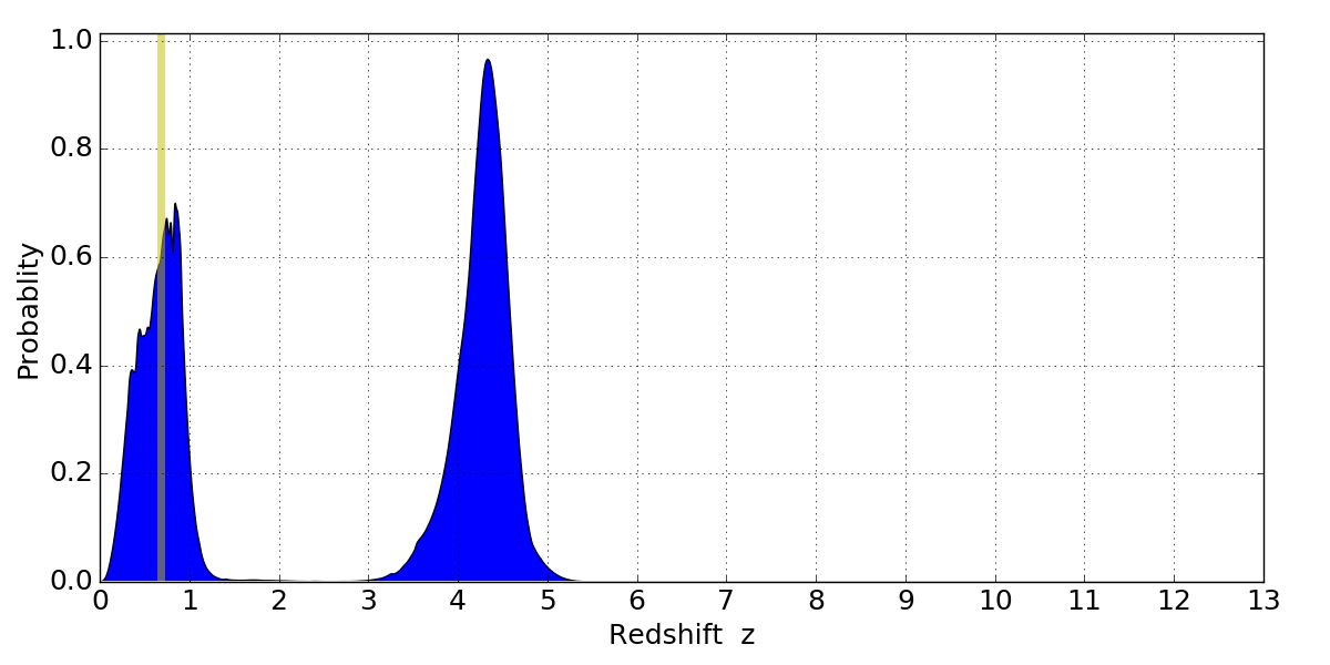 In P(z) plots: Yellow lines mark the cluster redshift z = 0.677,
