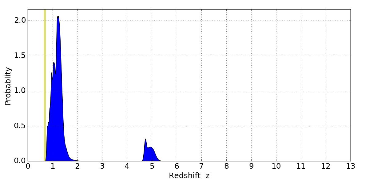In P(z) plots: Yellow lines mark the cluster redshift z = 0.677,