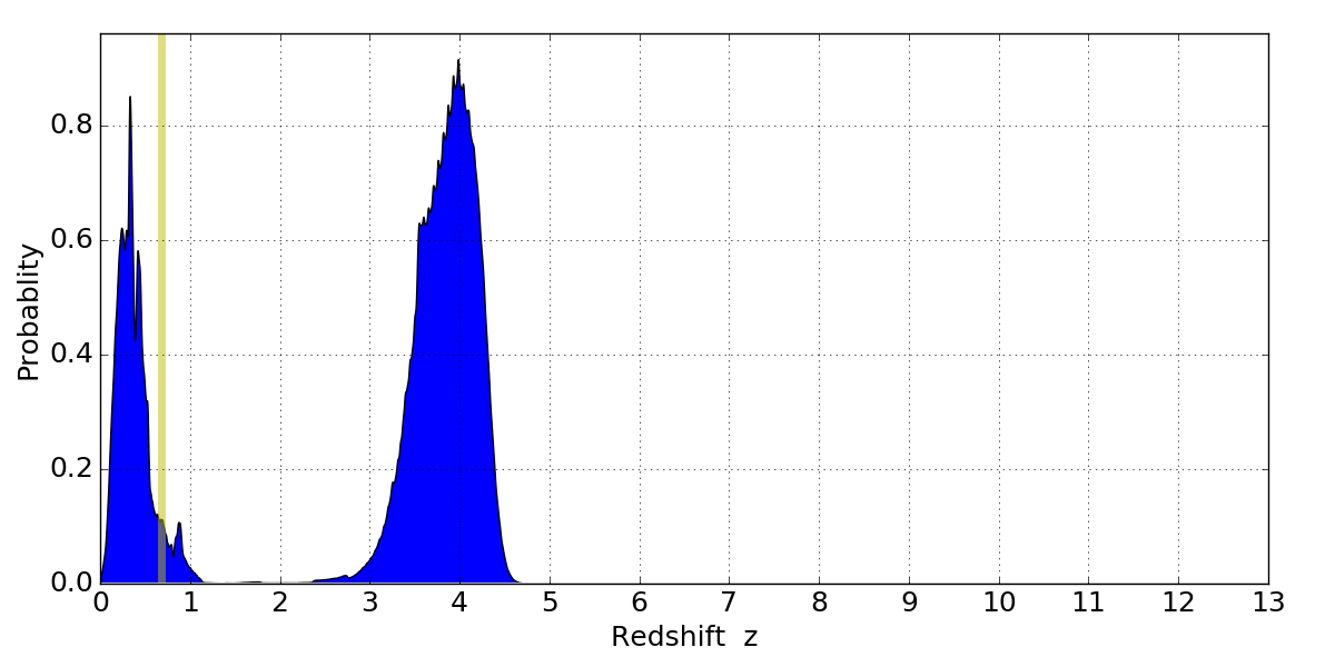 In P(z) plots: Yellow lines mark the cluster redshift z = 0.677,