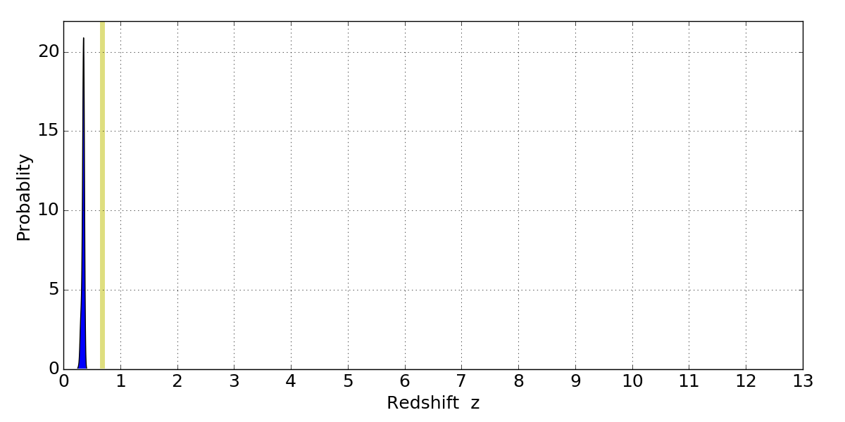 In P(z) plots: Yellow lines mark the cluster redshift z = 0.677,