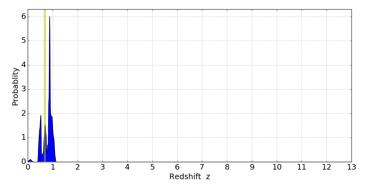 In P(z) plots: Yellow lines mark the cluster redshift z = 0.677,