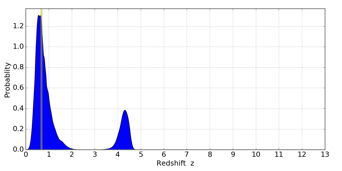 In P(z) plots: Yellow lines mark the cluster redshift z = 0.677,