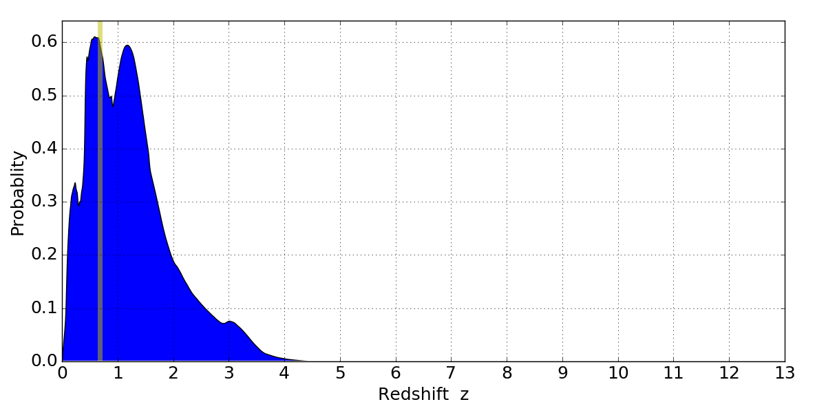 In P(z) plots: Yellow lines mark the cluster redshift z = 0.677,