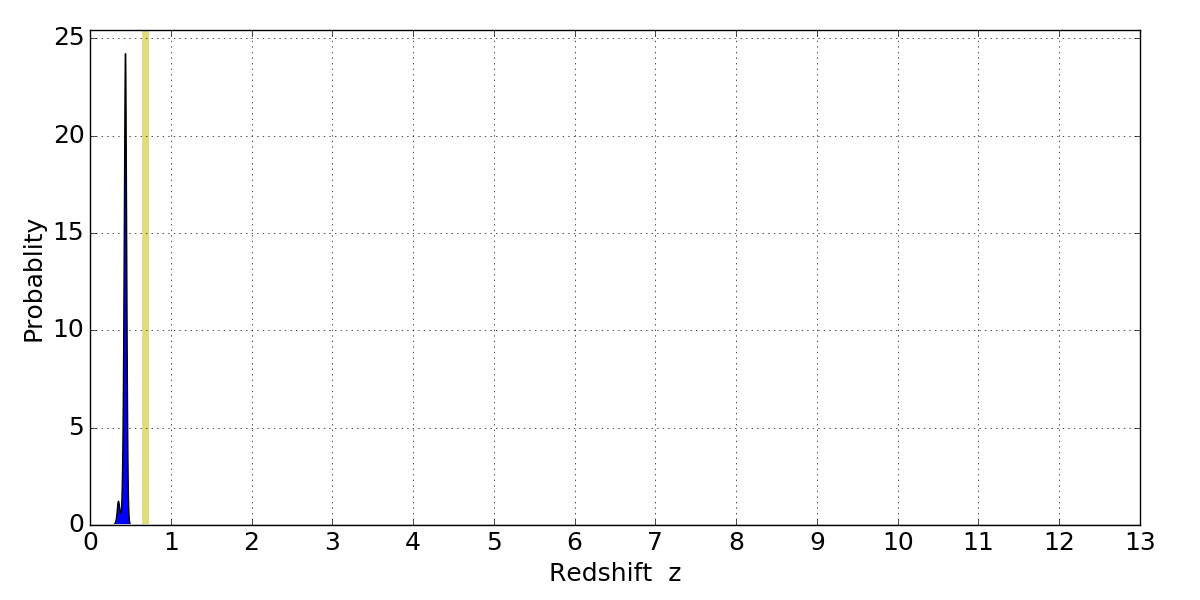 In P(z) plots: Yellow lines mark the cluster redshift z = 0.677,