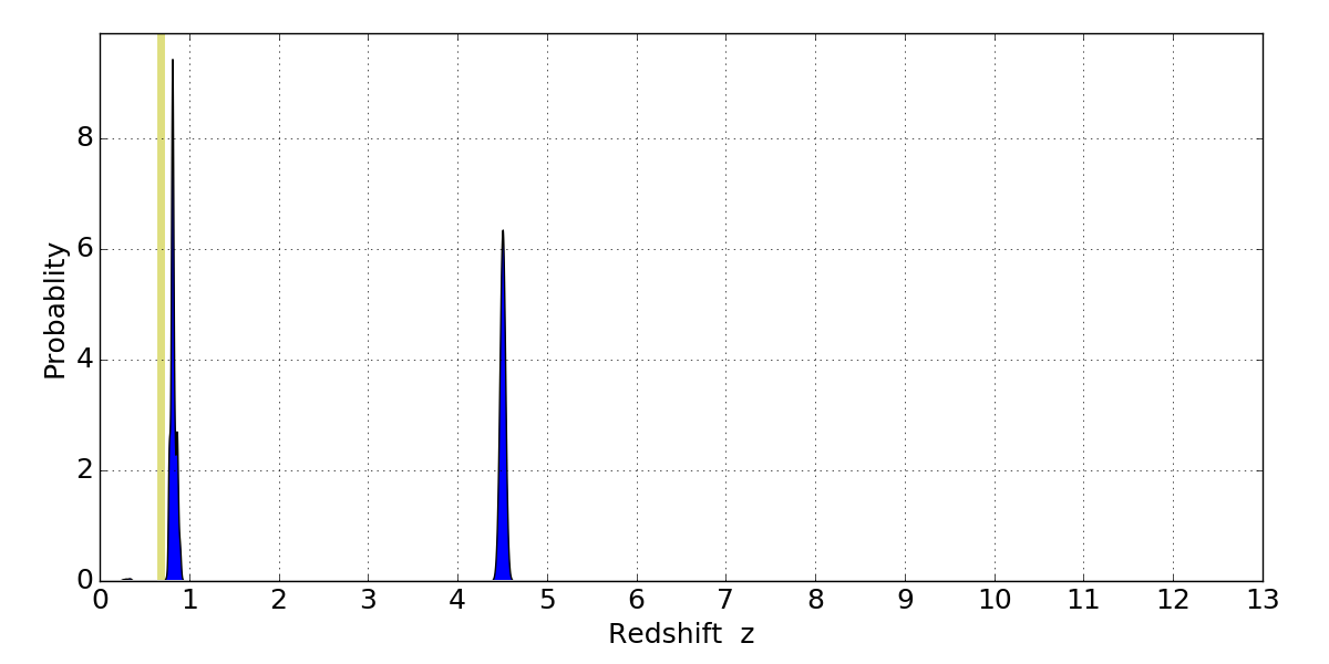 In P(z) plots: Yellow lines mark the cluster redshift z = 0.677,