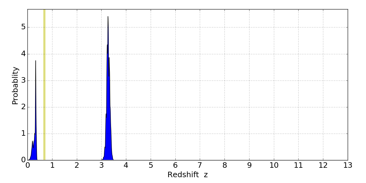 In P(z) plots: Yellow lines mark the cluster redshift z = 0.677,