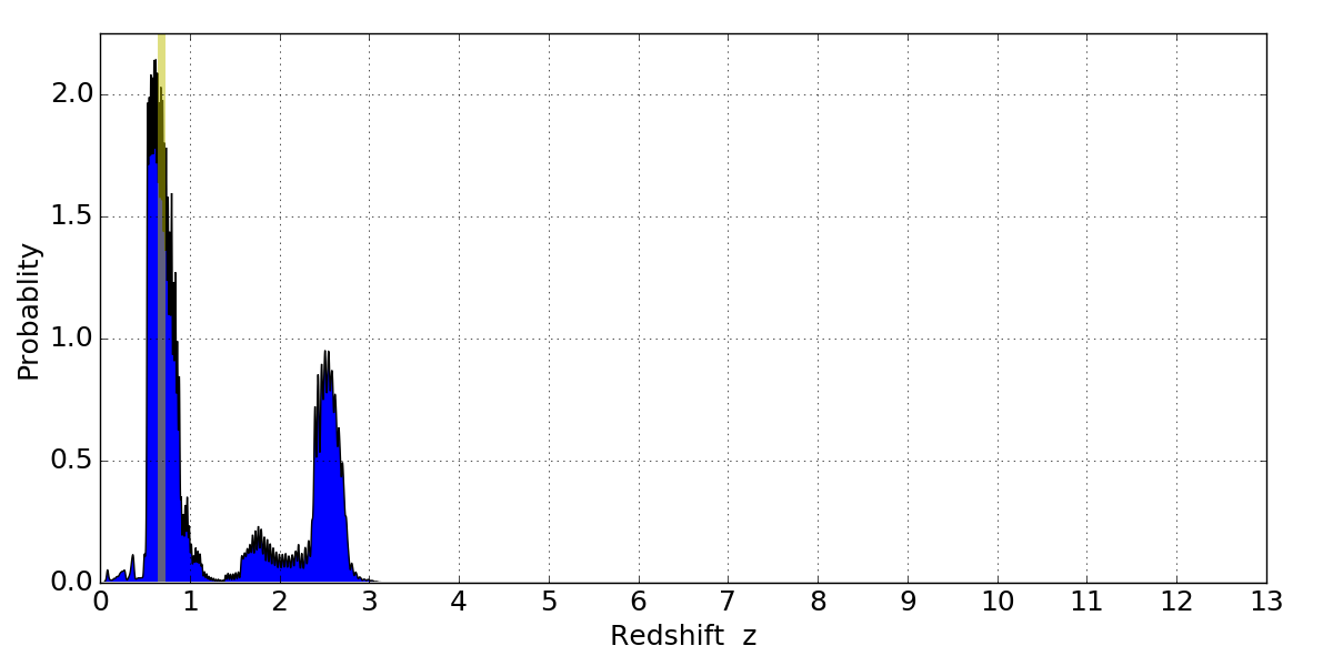 In P(z) plots: Yellow lines mark the cluster redshift z = 0.677,