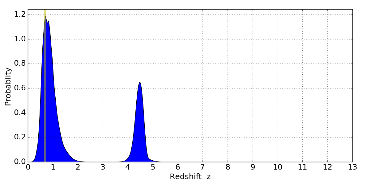 In P(z) plots: Yellow lines mark the cluster redshift z = 0.677,
