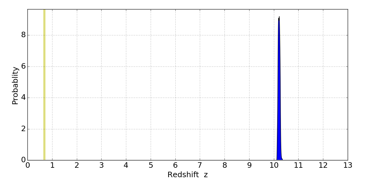 In P(z) plots: Yellow lines mark the cluster redshift z = 0.677,