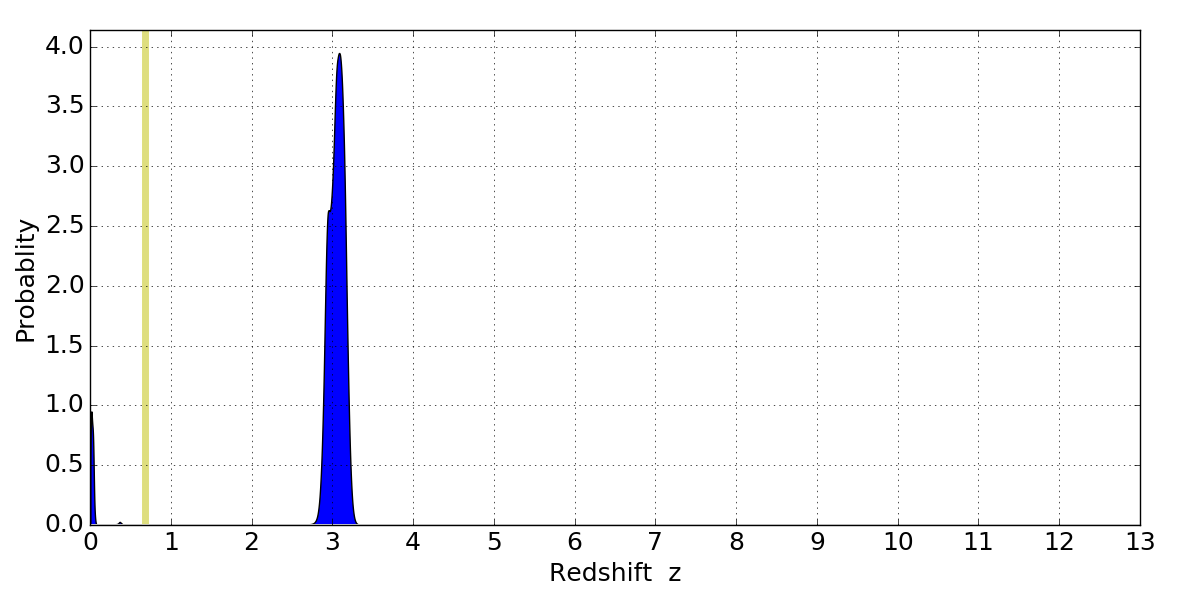In P(z) plots: Yellow lines mark the cluster redshift z = 0.677,