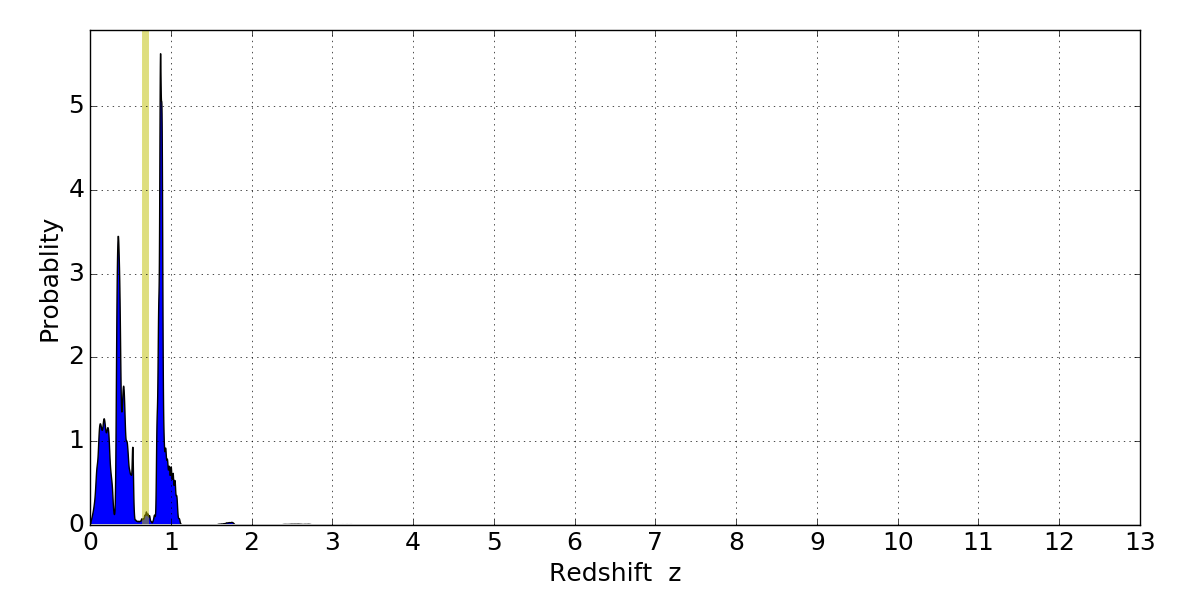 In P(z) plots: Yellow lines mark the cluster redshift z = 0.677,