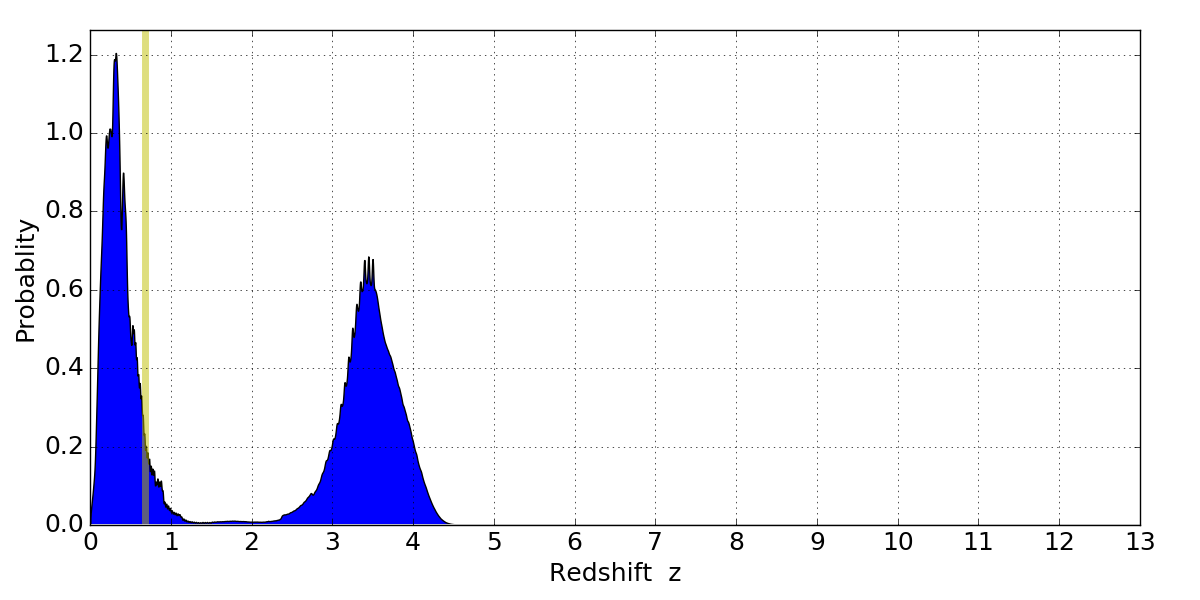 In P(z) plots: Yellow lines mark the cluster redshift z = 0.677,