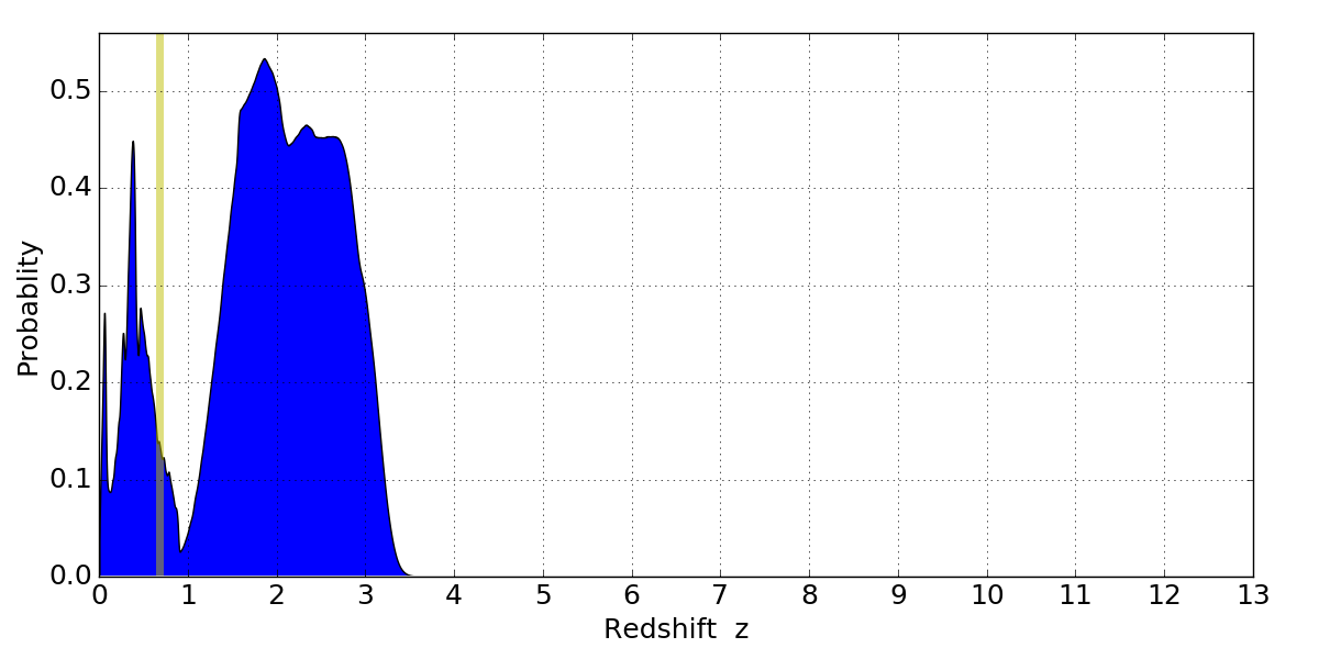 In P(z) plots: Yellow lines mark the cluster redshift z = 0.677,