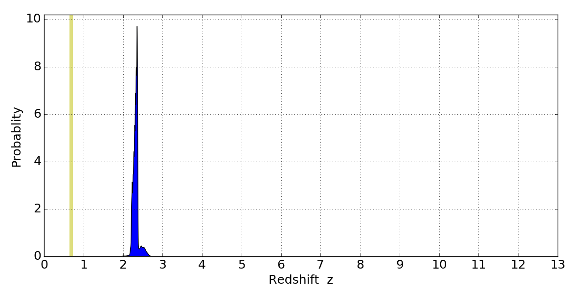 In P(z) plots: Yellow lines mark the cluster redshift z = 0.677,