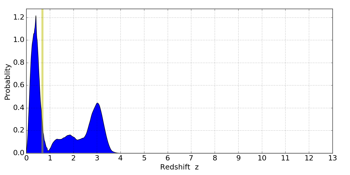 In P(z) plots: Yellow lines mark the cluster redshift z = 0.677,