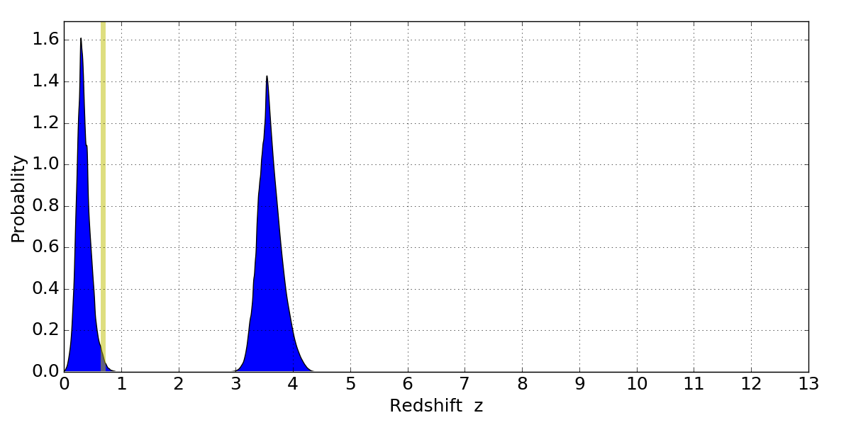 In P(z) plots: Yellow lines mark the cluster redshift z = 0.677,