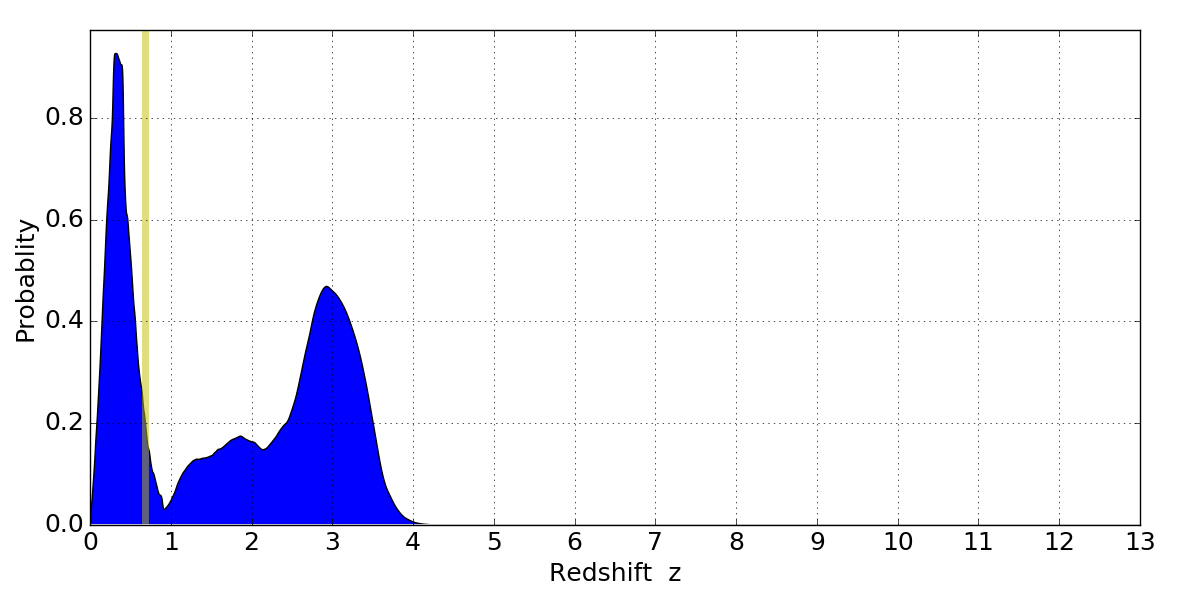 In P(z) plots: Yellow lines mark the cluster redshift z = 0.677,
