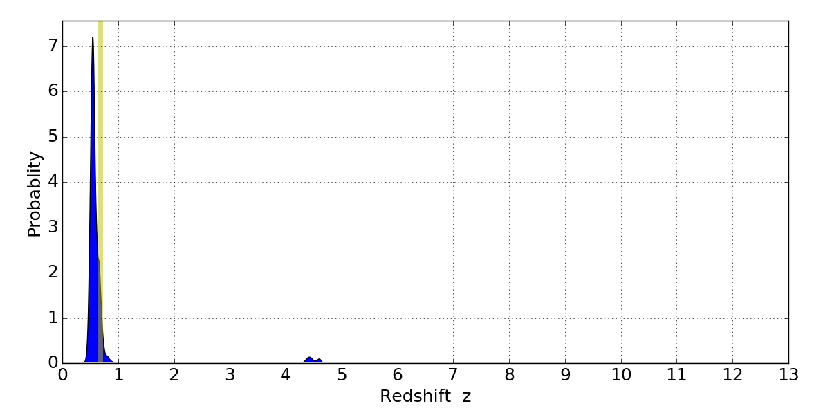 In P(z) plots: Yellow lines mark the cluster redshift z = 0.677,
