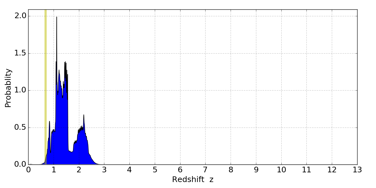 In P(z) plots: Yellow lines mark the cluster redshift z = 0.677,