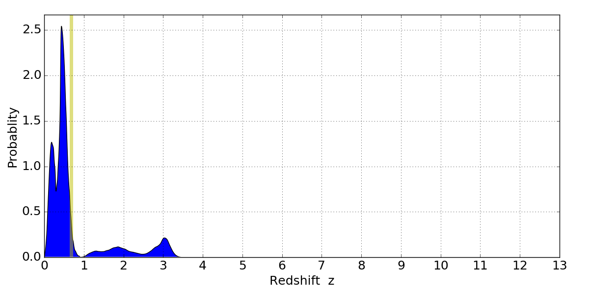 In P(z) plots: Yellow lines mark the cluster redshift z = 0.677,