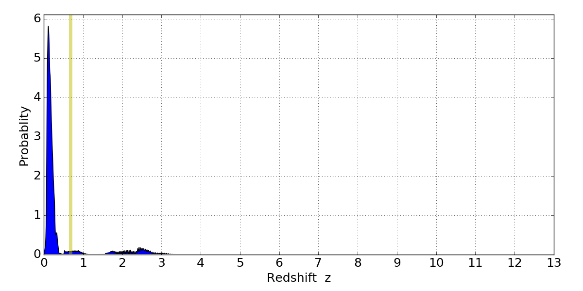 In P(z) plots: Yellow lines mark the cluster redshift z = 0.677,