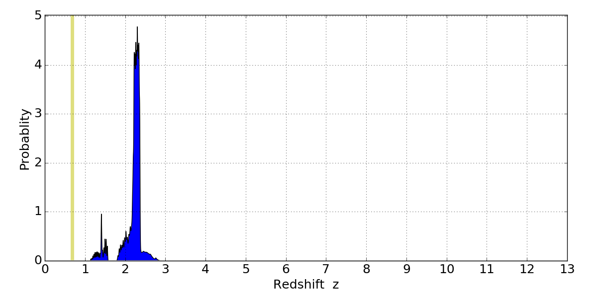 In P(z) plots: Yellow lines mark the cluster redshift z = 0.677,