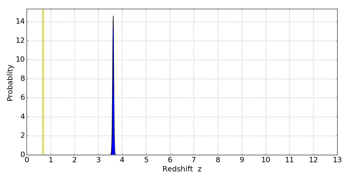 In P(z) plots: Yellow lines mark the cluster redshift z = 0.677,