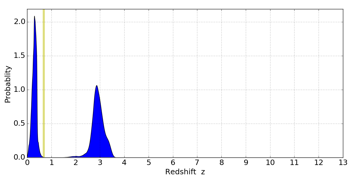In P(z) plots: Yellow lines mark the cluster redshift z = 0.677,