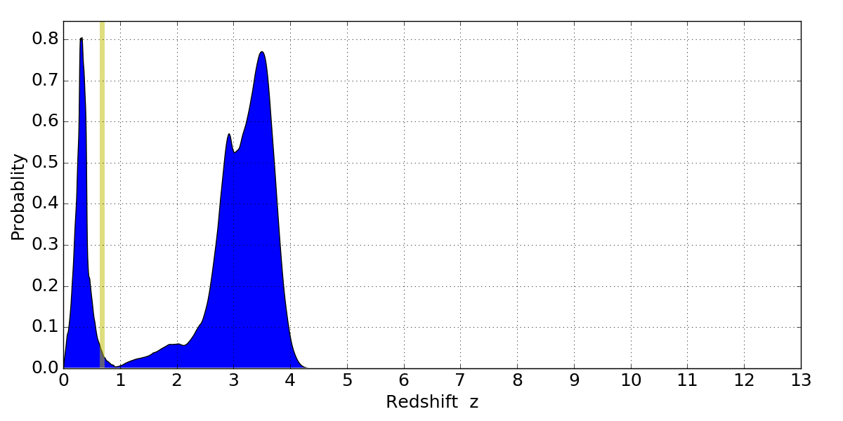In P(z) plots: Yellow lines mark the cluster redshift z = 0.677,