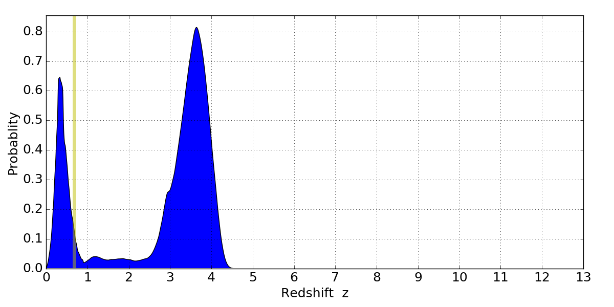 In P(z) plots: Yellow lines mark the cluster redshift z = 0.677,