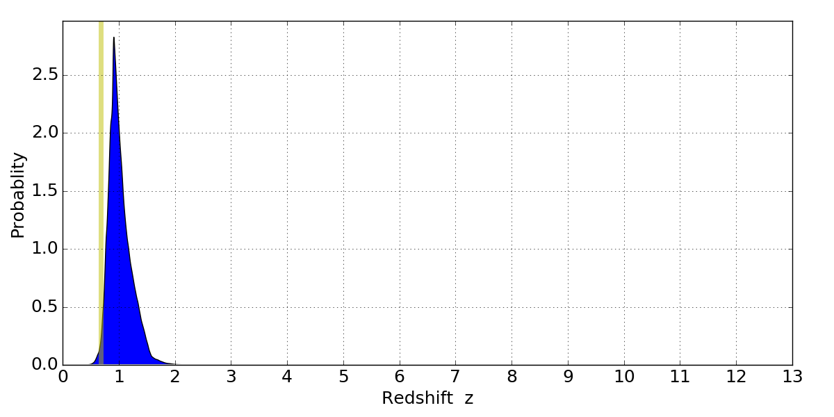 In P(z) plots: Yellow lines mark the cluster redshift z = 0.677,