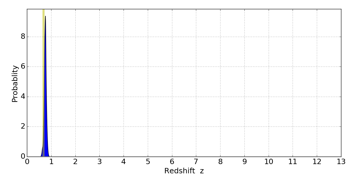 In P(z) plots: Yellow lines mark the cluster redshift z = 0.677,