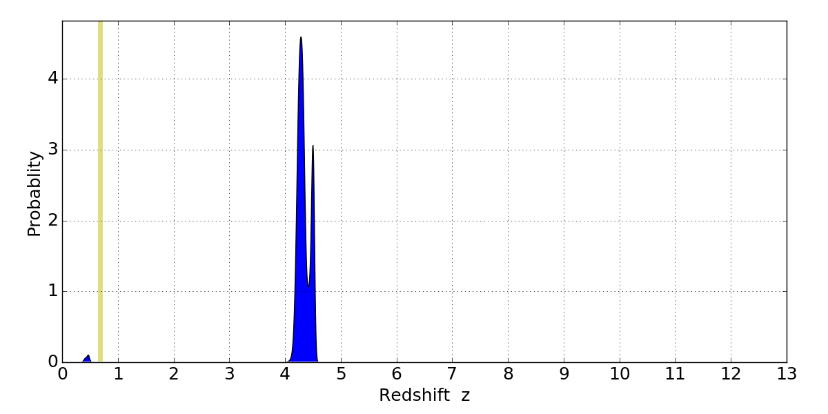 In P(z) plots: Yellow lines mark the cluster redshift z = 0.677,
