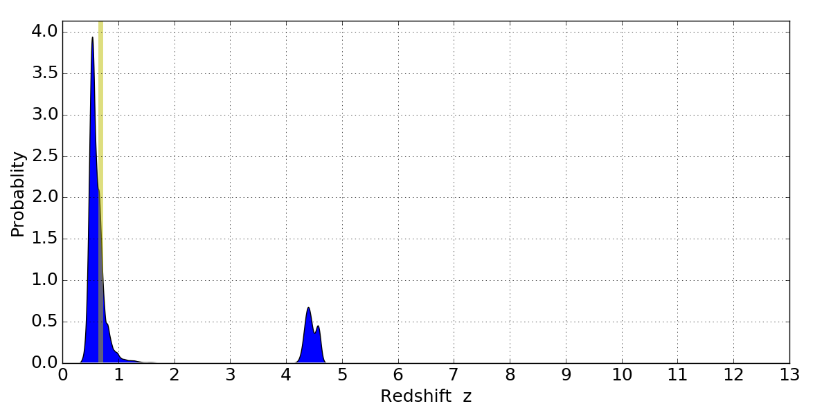 In P(z) plots: Yellow lines mark the cluster redshift z = 0.677,