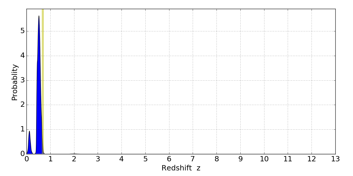 In P(z) plots: Yellow lines mark the cluster redshift z = 0.677,