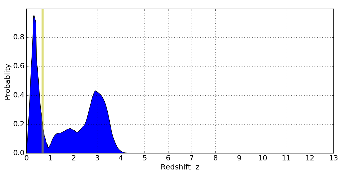 In P(z) plots: Yellow lines mark the cluster redshift z = 0.677,