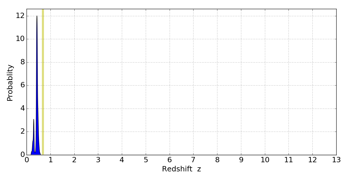 In P(z) plots: Yellow lines mark the cluster redshift z = 0.677,