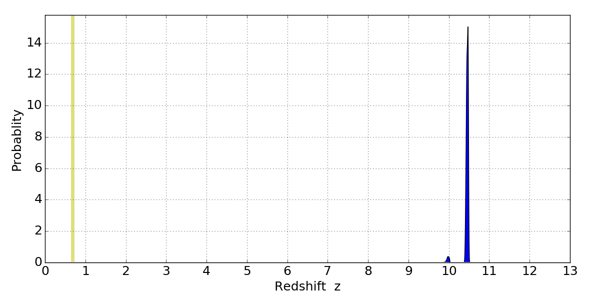 In P(z) plots: Yellow lines mark the cluster redshift z = 0.677,