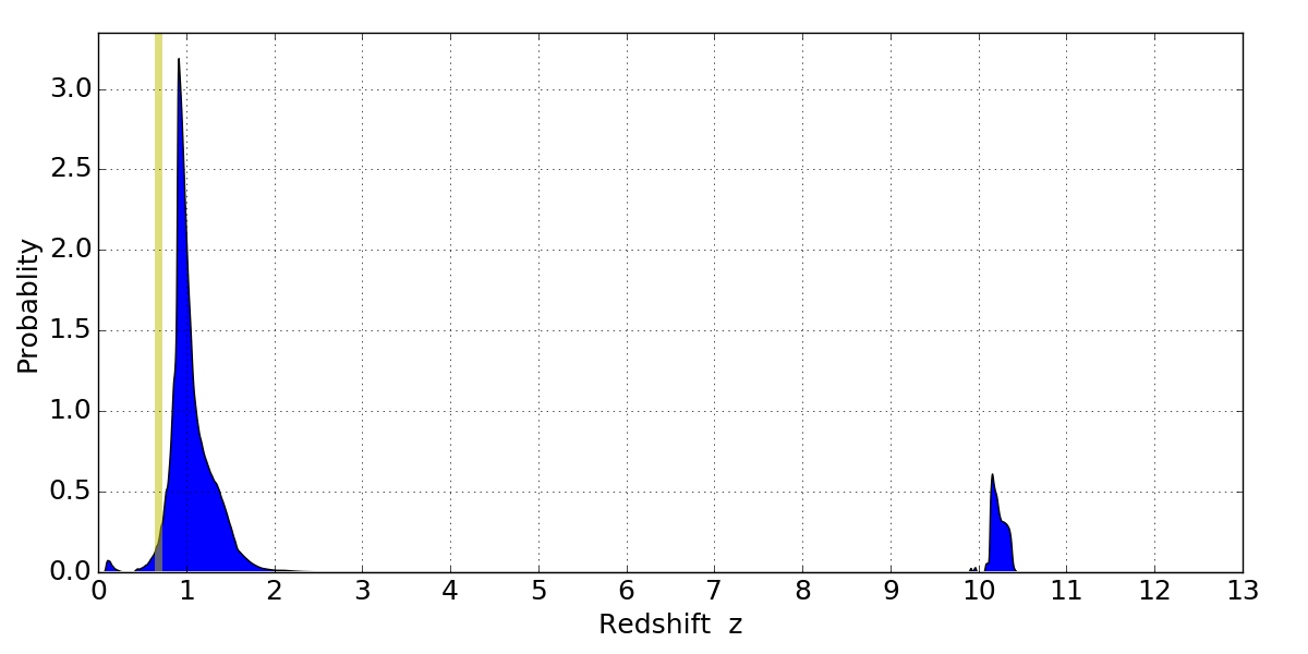 In P(z) plots: Yellow lines mark the cluster redshift z = 0.677,