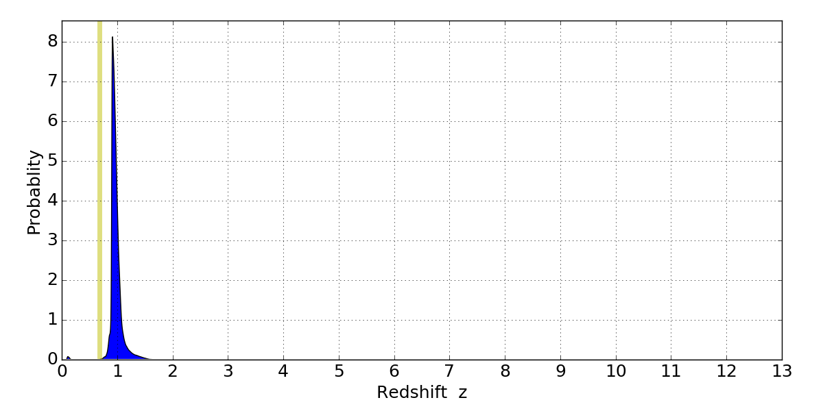 In P(z) plots: Yellow lines mark the cluster redshift z = 0.677,