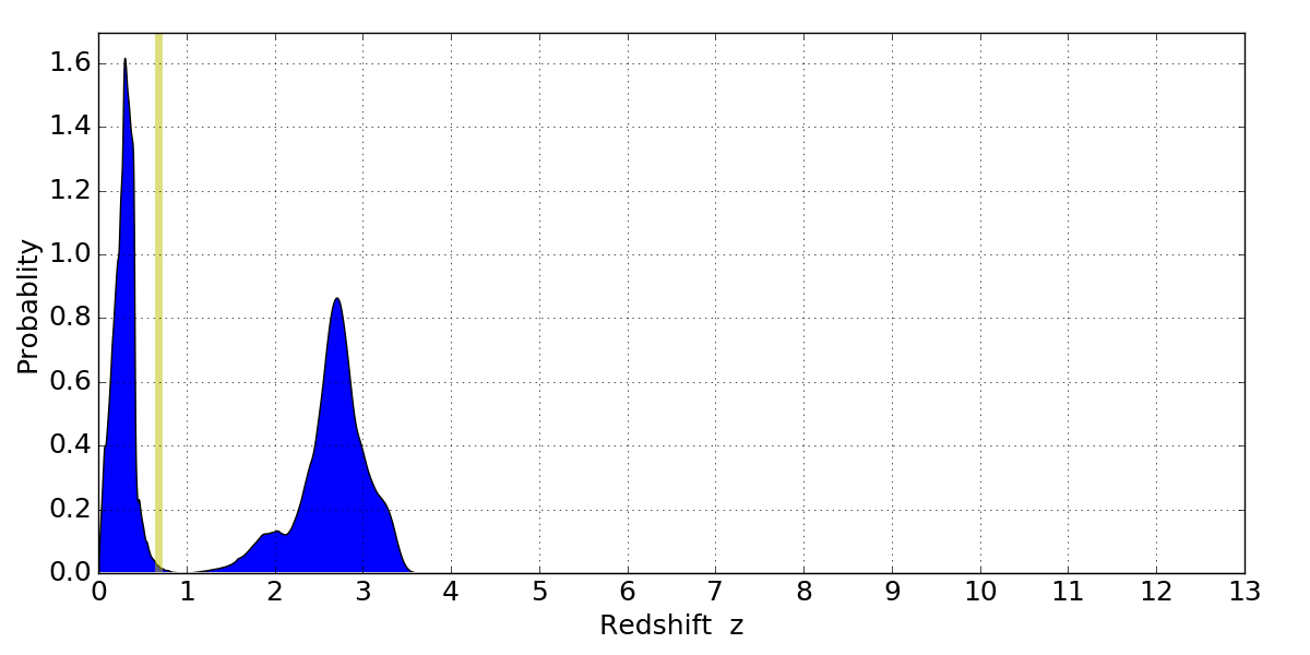 In P(z) plots: Yellow lines mark the cluster redshift z = 0.677,