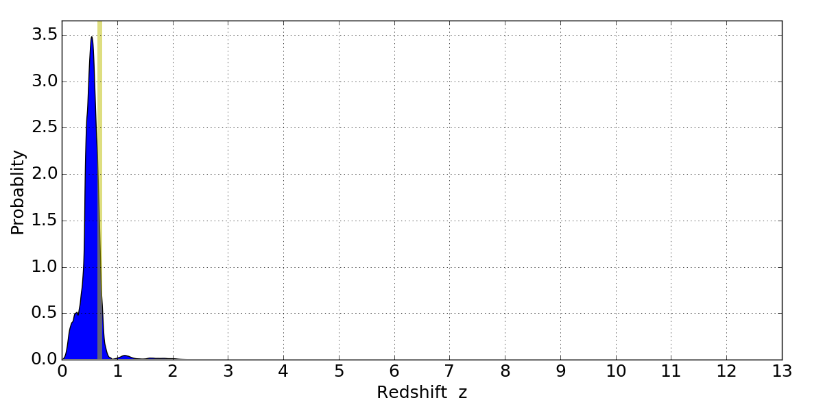 In P(z) plots: Yellow lines mark the cluster redshift z = 0.677,