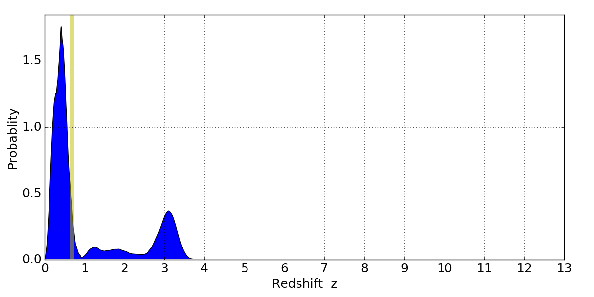 In P(z) plots: Yellow lines mark the cluster redshift z = 0.677,