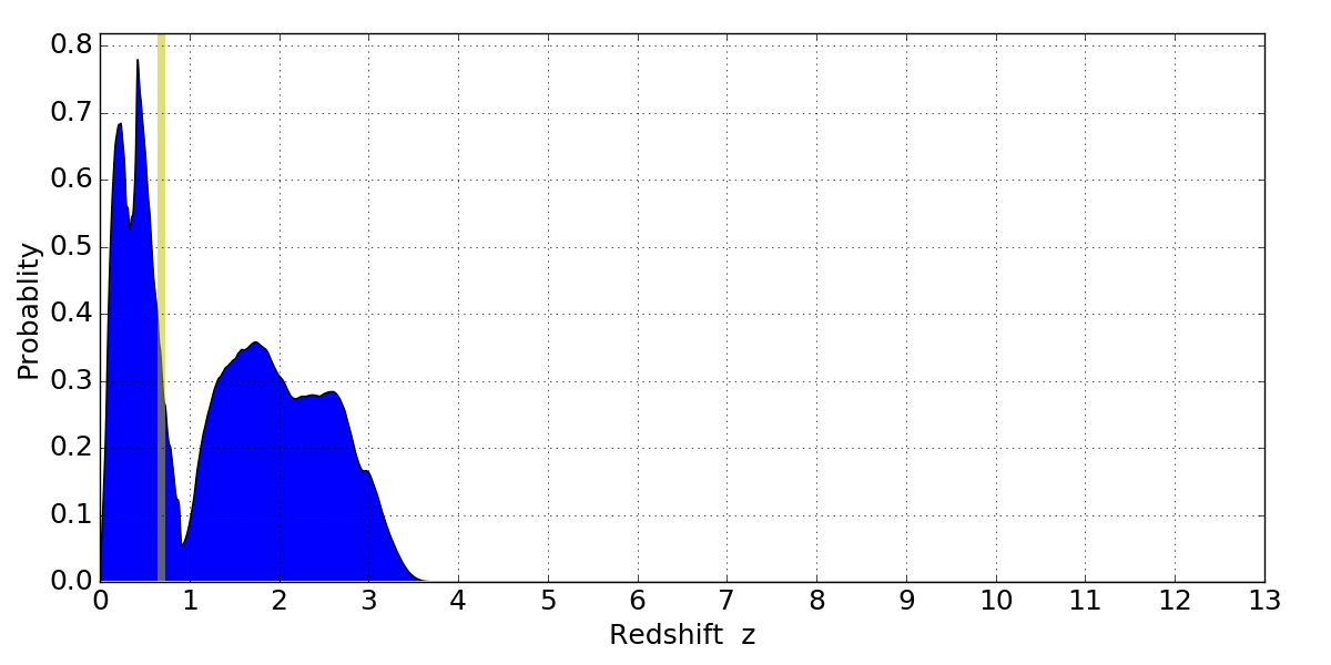 In P(z) plots: Yellow lines mark the cluster redshift z = 0.677,