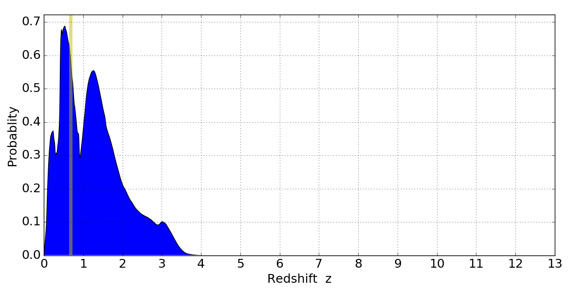 In P(z) plots: Yellow lines mark the cluster redshift z = 0.677,