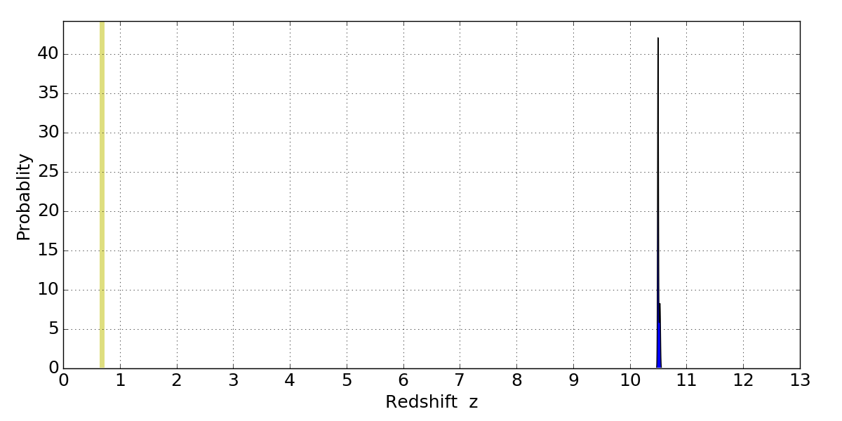 In P(z) plots: Yellow lines mark the cluster redshift z = 0.677,